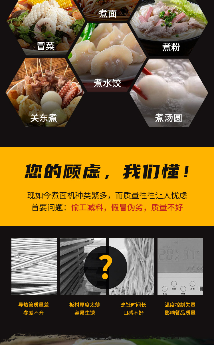 訂購標配:智能溫控系統、獨立控制自動升降桿、高峰期和非高峰期煮制模式、低水位斷電保護、大功率噴流罩、精制面簍