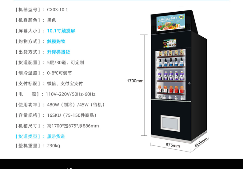 訂購標配:(0°c~8°c )制冷機組+數(shù)碼電子標簽+智能防盜門+智能電動取貨門+10.1寸液晶屏+觸摸屏+安卓主機+微信及支付寶支付